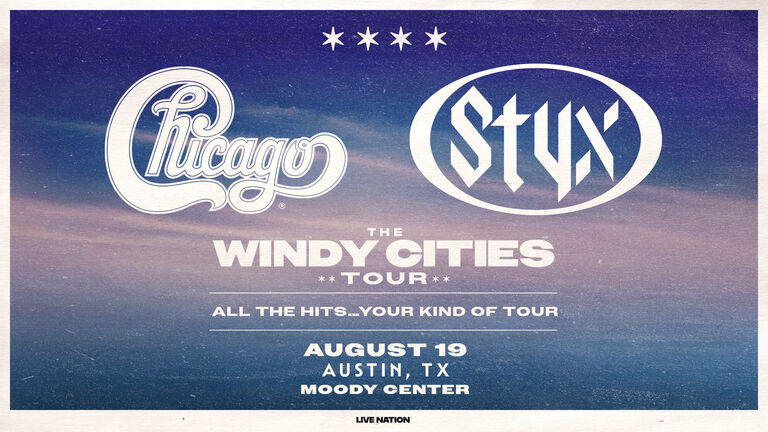 Styx & Chicago are coming to Moody Center on Wednesday, August 19, 2026 for The Windy Cities Tour – All The Hits…Your Kind of Tour